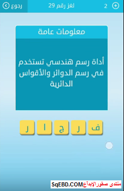 أداة رسم هندسي تستخدم في رسم الدوائر والأقواس الدائرية مكون من خمسة احرف لغز رقم 45 لعبة. اجابة لغز اداة رسم هندسى تستخدم فى رسم الدوائر والاقواس الدائرية من لعبة رشفة لغز رقم 29 للمجموعة الرابعة اخوتى الكــــرام اسعد الله اوقاتكـــم بكل خيــــر وارجعنالكم وحل اخر من لعبة رشفة لعبة شيقة ثقافية معلومات عامة. والاقواس الدائرية ومكونة من 5 حروف هى فرجار. والأقواس الدائرية من 5 حروف والاجابة هي فرجار.