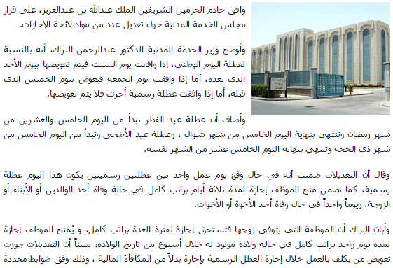 ألزمت وزارة العمل القطاع الخاص بتعويض العاملين لديهم بيوم إجازة إضافي إذا كانت الإجازة الأسبوعية لهم ضمن أحد أيام إجازة العيدين وعليه فإنه يتم تمديد الإجازة يوما آخر.