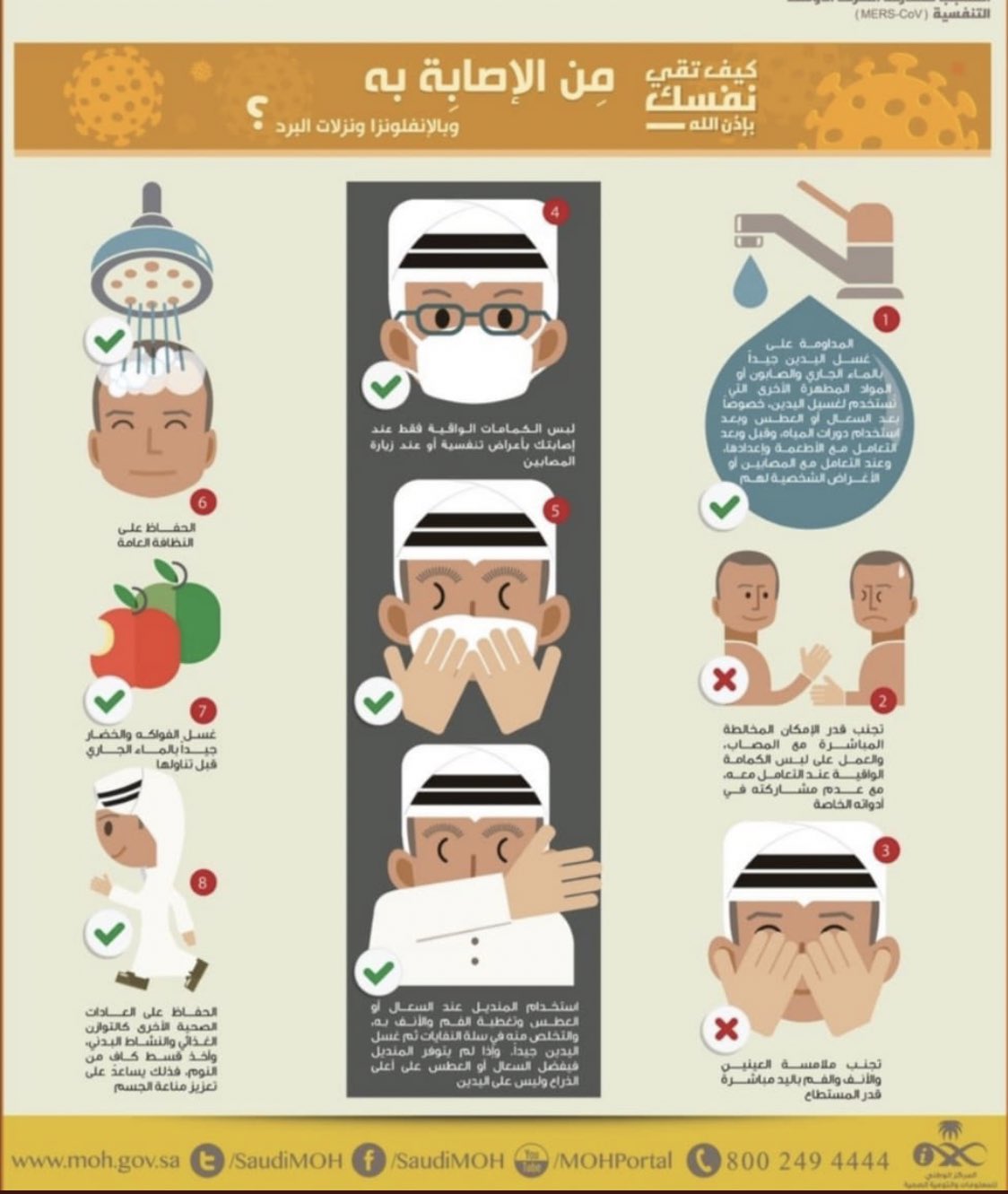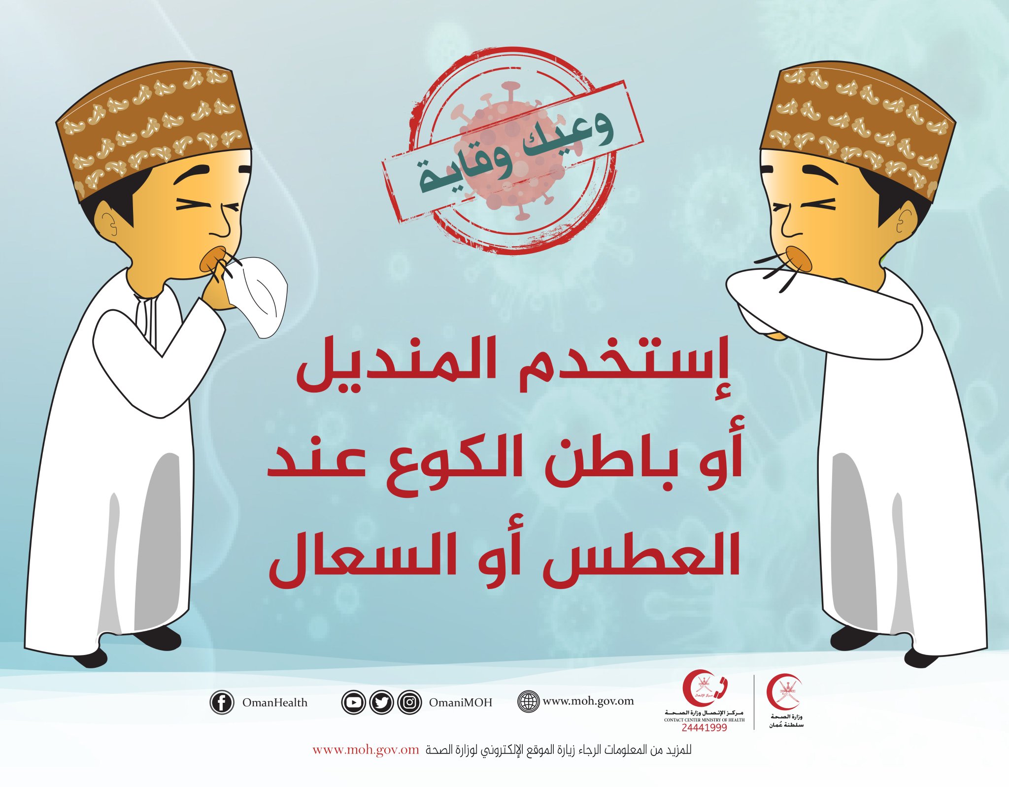 تغطية الفم والأنف بمنديل عند السعال أو العطاس. كما يجب رمي المنديل في القمامة بعد استعماله. ونصحت المدينة الطبية باستخدام المنديل عند السعال أو العطاس في تغطية الفم والأنف وغسل اليدين بشكل دوري بالمياه والصابون أو استخدام الج ل المعقم قبل وبعد تناول الطعام وبعد استعمال دورات. استعمال المنديل عند العطاس وكذلك عند السعال والتخلص منه فورا عند الانتهاء منه.