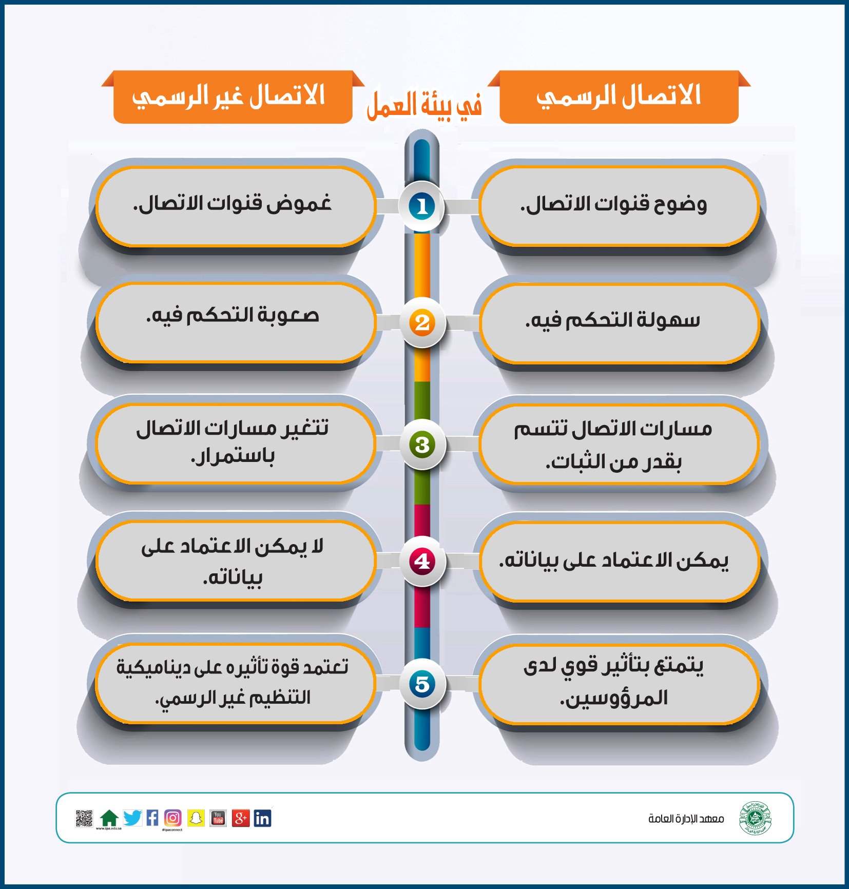 هذا الاتصال هو مرتبط بهيكل التنظيم الرسمي ومنصب عمل أو رتبة المتلقي والمستقبل ينتقل عبر القنوات الرسمية المعترف بها في المخطط التنظيمي. الاتصالات الرسمية هي في معظمها. والاتصال غير الرسمي يتمثل بالاوامر او التحادث الشفهي بين نفس اطراف الاتصال ولكن. ب الاتصال غير الرسمي ويتم هذا الاتصال خارج القنوات الرسمية المحددة للاتصال وتعتمد على قوة العلاقات بين التنظيم الإداري في المؤسسه والعاملون في المؤسسه مع بعضهم لتسهيل الأمور التنظيمية.