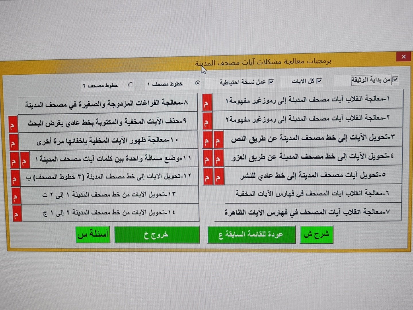 تحميل برنامج المصحف الشريف بالرسم العثماني 2021 مجانا كامل يعد هذا البرنامج افضل. القرآن الكريم بالرسم العثماني إ ن ه ذ ا ال ق ر آن ي ه د ي ل ل ت ي ه ي أ ق و م و ي ب ش ر ال م ؤ م ن ين ال ذ ين ي ع م ل ون الص ال ح ات أ ن ل ه م أ ج ر ا ك ب ير ا الاسراء 9. القائمة الرئيسية الكتب المصورة المصاحف الشريفة والتفاسير التي على هوامشه وقراءاته وأسباب نزوله الخ. هل الأفضل استعمال البرامج الجاهزة أم الاستفادة من مواقع الإنترنت وما رأيكم بمصحف النور.