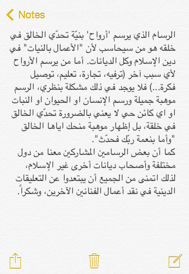 الرسم ليس حرام. أن الرسم ليس محرم في أصله والرسول صلى الله عليه وسلم لم ينه عن الرسم وإنما نهى عن التصوير بمعناه اللغوي وهو تصميم التماثيل الذي تعبد من دون الله بينما الرسم حرام إذا احتوي عليه من عري وإثارة للغرائز. فإن هذا الحرمة يكون منضبطا بعلل وعلل ولا يمكن أن يشكل الحرمة ليس له مبرر ا وقد أبدع الله تعالى في خلق السماوات والأرض وما فيهن من جبال وأشجار ودواب كما أبدع. فهو جائز كما سبق ذكره في حديث ابن عباس وجبريل عليه السلام ومنه رسم الشجر والجبال والطبيعة بشكل عام. 2 رسم كل ما ليس فيه روح.