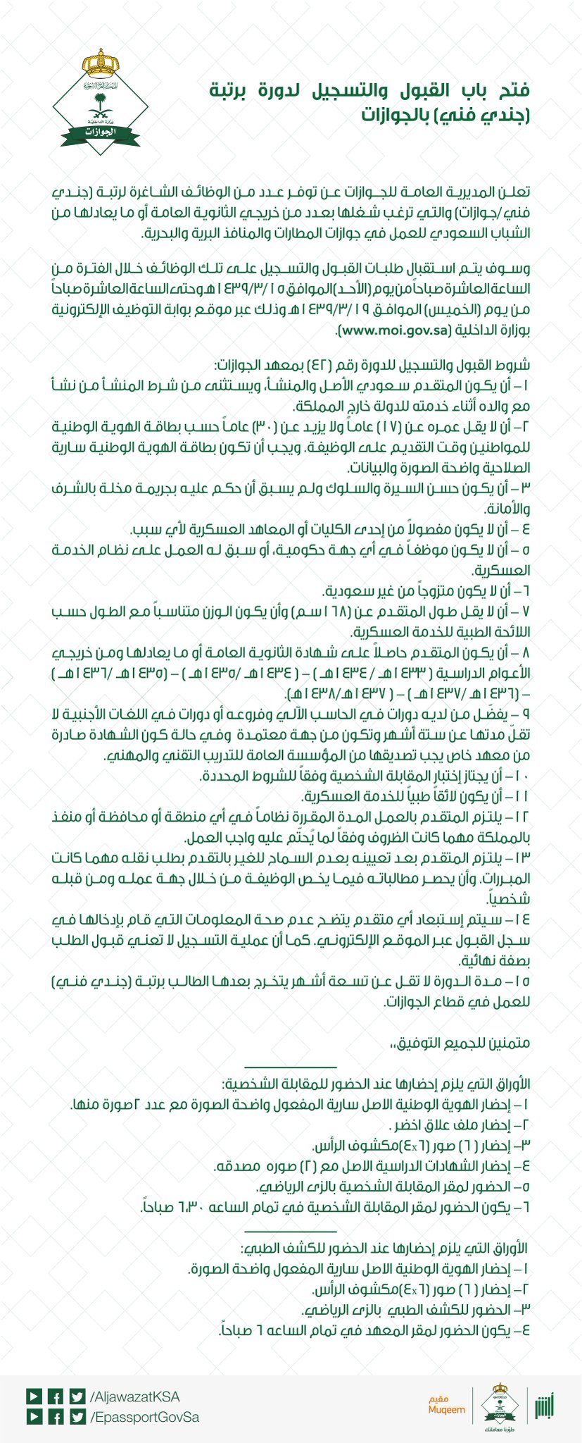 الزي الرسمي جندي نساء جوازات. التسجيل في الجوازات. وظائف الجوازات السعودية 1441 للنساء أعلنت مديرية الجوازات العامة اليوم عن توفر عدد من وظائفها الشاغرة برتبة جندي جوازات للكادر النسائي وسيتم استقبال طلبات راغبي شغل الوظائف من الشباب السعودي من خريجي الثانوية. هي خدمة الكترونية مقدمة من قبل أبشر للجوازات وذلك لتوفير العديد من الوظائف الخاصة بالجوازات ومنها جندي فني جوازات للعمل داخل المطارات والنوافذ البحرية والبرية وبعض الوظائف الأخرى الخاصة. أعلنت الإدارة العامة للقبول المركزي بوكالة وزارة الداخلية للشؤون العسكرية عن فتح باب القبول والتسجيل بالمديرية العامة للجوازات على رتبة جندي رجال للتعيين عليها في مناطق المملكة وذلك وفق الشروط التالية.