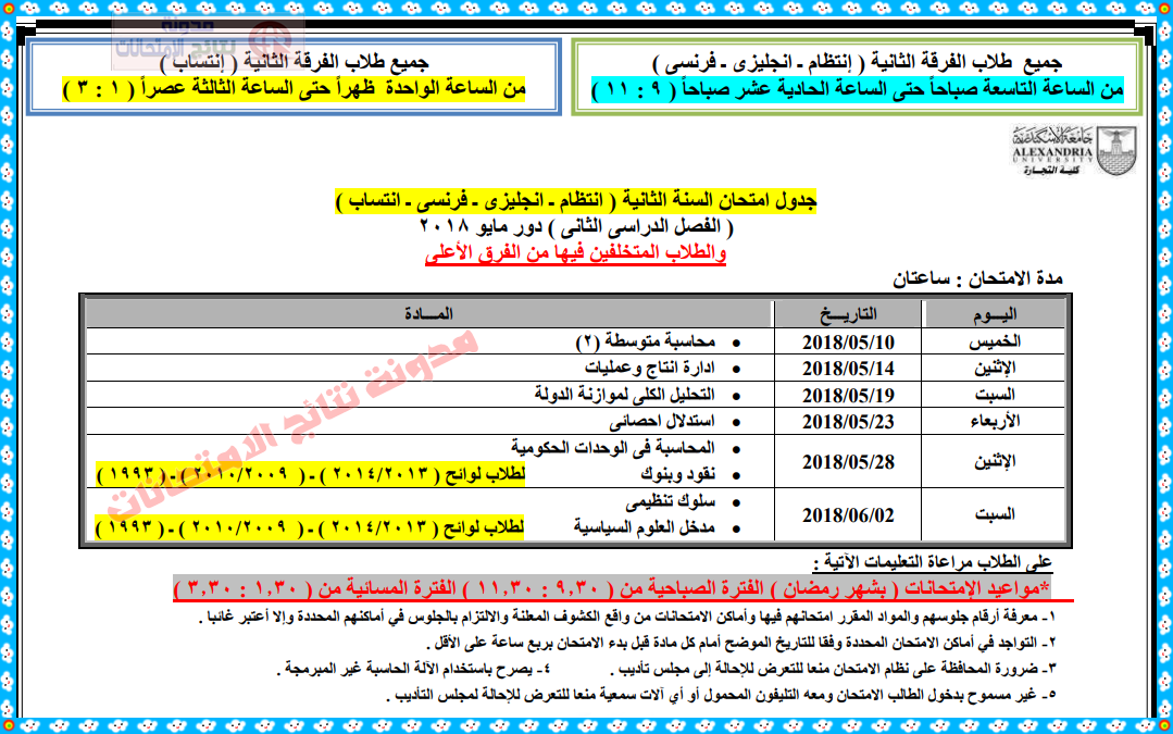 الصفحة الرسمية كلية التجارة جامعة الاسكندرية ٢٥ أكتوبر ٢٠١٧ ارقام جلوس امتحان منتصف الفصل الدراسي الأول العام الجامعي2017 2018 لطلاب الشعبة الانجليزية والفرنسية midterm 2018 علما بأن طلاب. 3 710 likes 73 talking about this. تطمح كلية الحقوق جامعة الاسكندرية الى تحقيق التطوير المستمر في العملية التعليمية. ١٠٨ ألف تسجيل إعجاب.