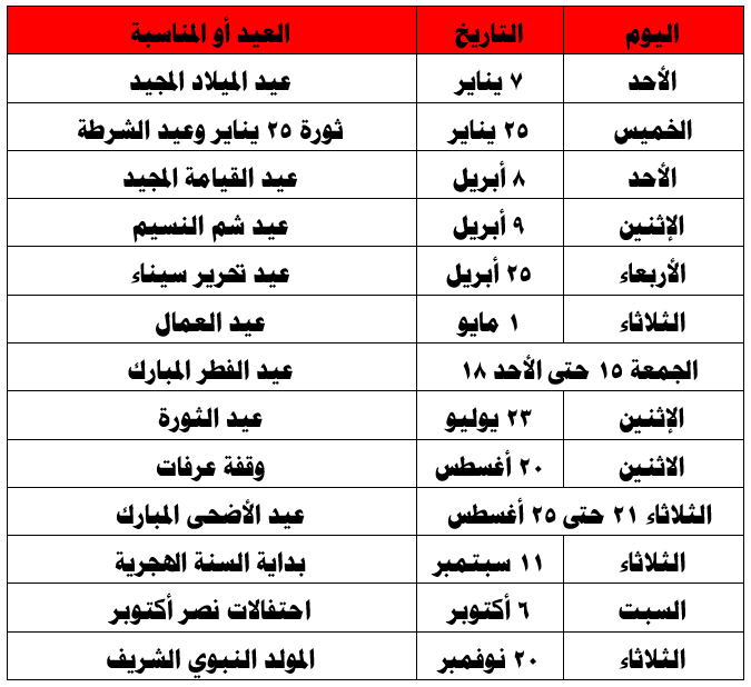 العطلات الرسمية 2018. مصر العطلات الرسمية 2018 تحتوي هذه الصفحة على تقويم وطني لجميع العطلات الرسمية لعام 2018 في مصر. لكل من يبحث عن العطلات الرسمية للعام الميلادي الجديد 2018 نقدم لكم اليوم علي موقع أوائل جدول يحتوي علي مواعيد الاجازات الرسمية والمواعيد حسب التاريخ واليوم وعدد أيام الأجازة نعلم أن الكثير يبحثون عن الاجازات في العام. دولة قطر العطل الرسمية لعام 2018 تحتوي هذه الصفحة على تقويم محلي لجميع أيام العطلات الرسمية لعام 2018 في دولة قطر. ويلاحظ العيد عيد الفصح من قبل المسيحيين فقط.