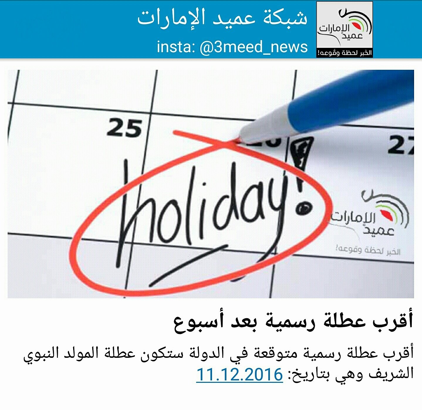 العطلة الرسمية في الامارات 2016