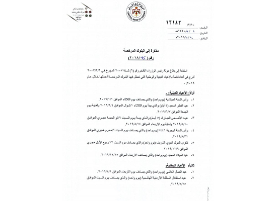 العطل الرسمية في الاردن 2014. خاص سما الاردن منذ بداية عام 2020 بحث الأردنيون بكثرة عن العطل الرسمية في الاردن 2020 ليبدأ البعض بعمل اجنداتهم وتحديد مواعيد السفر والرحلات بناء عليها. وكالة الناس بعد انتهاء عام 2018 وبداية العام الجديد 2019 عادة ما يتساءل ويبحث عنه الأردنيون بكثرة عن العطل الرسمية في الاردن 2019 ليبدأ البعض بعمل اجنداتهم وتحديد مواعيد السفر والرحلات بناء عليها. وجه البنك المركزي الاردني وبإيعاز من مجلس الوزراء الى جميع البنوك العاملة في الاردن قائمة بأيام ومواعيد العطل للدوائر والمؤسسات الرسمية والخاصة لبعض المناسبات الرسمية والدينية في المملكة للعام القادم 2019 والذي سيطل. قائمة العطل الرسمية في الأردن من ويكيبيديا الموسوعة الحرة اذهب إلى التنقل اذهب إلى البحث.
