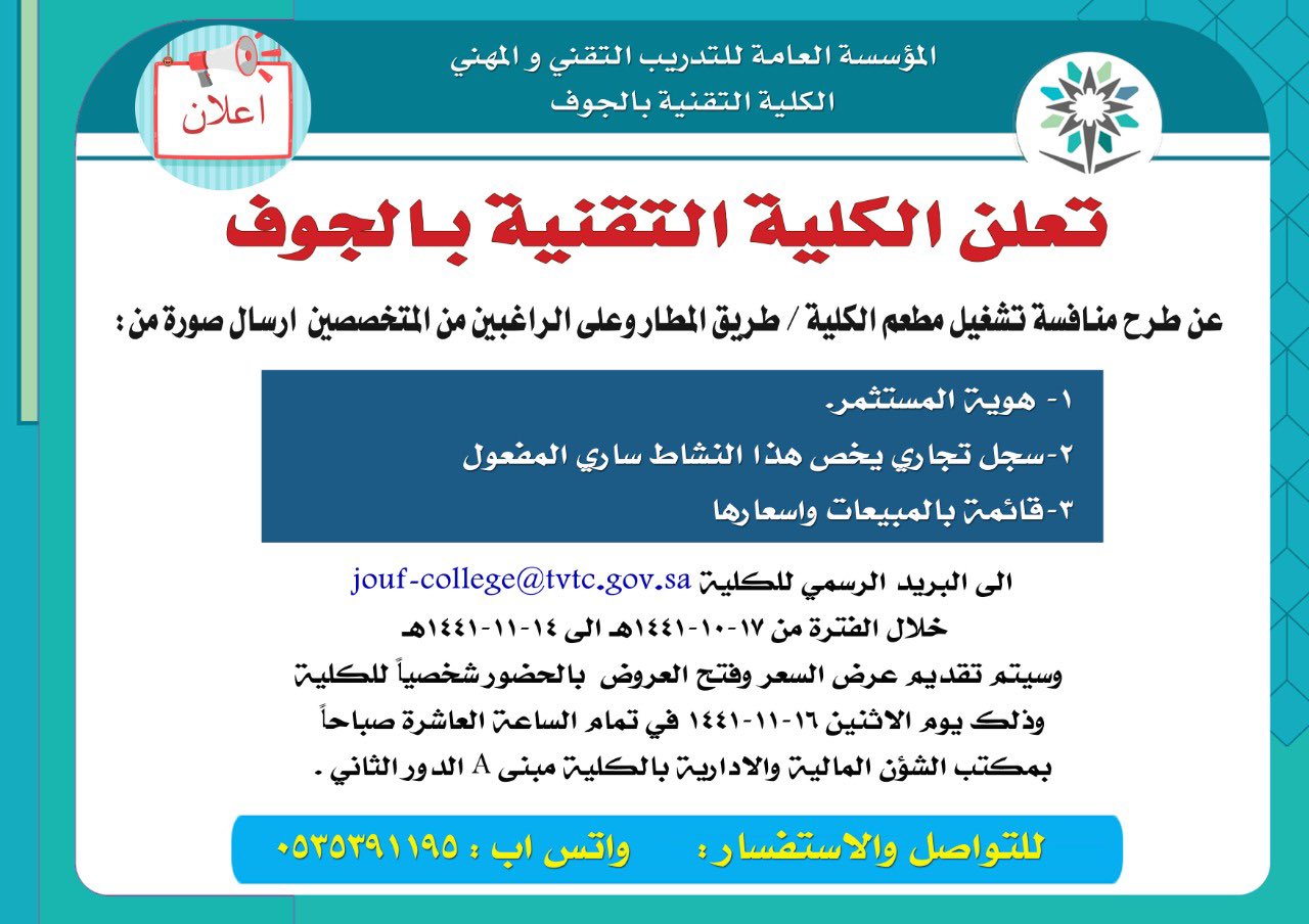 أعلنت الكلية التقنية العالمية للبنات في سكاكا شراكة أكسفورد عن بدء القبول والتسجيل في الكلية من الساعة ٩ ٠٠ صباح ا وحتى الساعة 3 ٠٠ مساء من يوم الأحد إلى الأربعاء حيث أوضحت الكلية خطوات التسجي. عزيزي المتقدم اهلا بك في بوابة القبول الموحد لبرامج المؤسسة العامة للتدريب التقني والمهني يمكنك. أعلنت كلية التقنية بمنطقة الجوف عن تعليق الدراسة اليوم الاثنين.