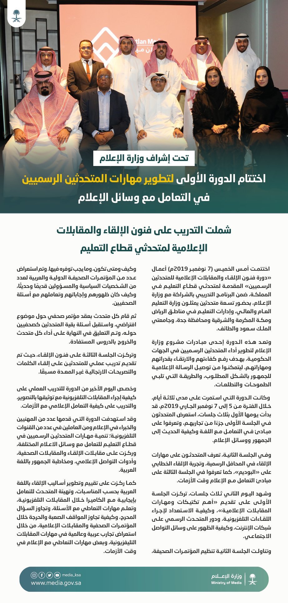 المتحدثين الرسميين في التعليم. مكتب المتحدثين الرسميين ينشر المعلومات إلى وسائل الإعلام عن الانشطه الجاريه لوزارة التربيه والتعليم مواقفه وسياساته وتنشر تقارير عن الأحداث التي تجري في مجال التعليم. اختتمت أمس الخميس 7 نوفمبر 2019م أعمال دورة فنون الإلقاء والمقابلات الإعلامية للمتحدثين الرسميين المقدمة لمتحدثي قطاع التعليم في المملكة ضمن البرنامج التدريبي بالشراكة مع وزارة الإعلام بحضور تسعة متحدثين يمثلون. هاجر الشمري من الظهران ـ أنحاء ـ خلصت دراسة حديثة إلى أن أكثر من نصف المتحدثين الرسميين للجهات الحكومية في السعودية ليس لديهم حسابا على تويتر. أربعة متحدثين فقط من بين 18 نجحوا في فرضية مكة التي تهدف إلى قياس مدى تجاوب المتحدثين الرسميين لعدد من الجهات الحكومية مع وسائل الإعلام وردوا خلال أول ثلاثة أيام منذ بدء إرسال الاستفسارات في حين لم يرد 14 متحدثا خلال.