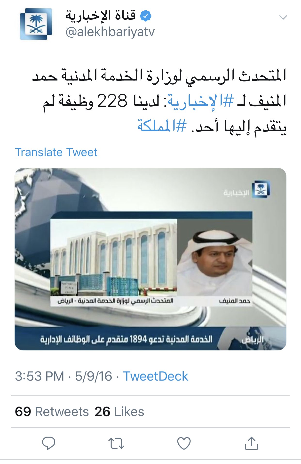 المتحدث الرسمي لوزارة الخدمة المدنية حمد المنيف. أكد المتحدث الرسمي لوزارة الخدمة المدنية حمد المنيف أن ظهور أسماء أخوات أو قريبات في الترشيح ونشر أسمائهن يؤكد شفافية الوزارة وتمسكها بمبدأ الجدارة في الترشيح. عل ق المتحدث الرسمي لوزارة الخدمة المدنية حمد المنيف على ما نشر حول وجود 20 000 من حاملي شهادة الدكتوراه والماجستير ليسوا على رأس العمل بأن من واقع سجلات الخدمة المدنية عدد المتقدمين على نظام جدارة يبلغ 20614 ألف متقدم. أعلن المتحدث الرسمي لوزارة الخدمة المدنية حمد المنيف أنه مع نهاية دوام اليوم الخميس تنتهي علاقته الرسمية بمهام المتحدث الرسمي لوزارة الخدمة المدنية مشيرا إلى تكليف سلطان الظاهر بمهام المتحدث الرسمي للوزارة. علق المتحدث الرسمي لوزارة الخدمة المدنية حمد المنيف على خبر منشور في إحدى الصحف المحلية حول استثناء 14 وظيفة من قرار مجلس الوزراء الخاص بإيقاف صرف البدلات والعلاوات موضحا أن 4 وظائف فقط مما ورد في الخبر يشملها قرار.