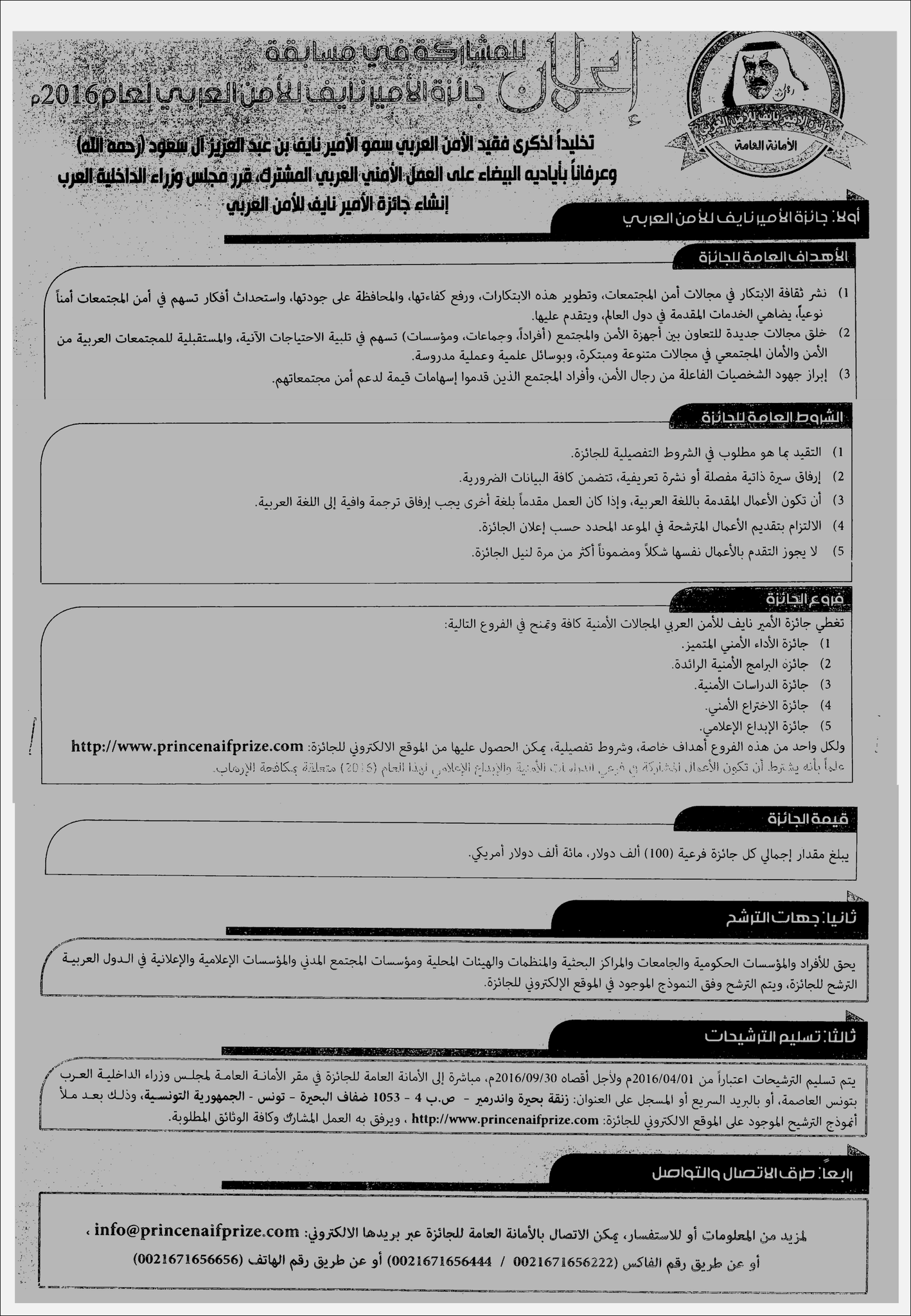 أعلنت الأمانة العامة لجائزة الأمير نايف للأمن العربي عن فتح بابا الاشتراك في مسابقة الجائزة لعام 2020 وتنقسم الجائزة الى خمسة فروع يبلغ إجمالي قيمة كل جائزة فرعية مائة ألف دولار وهي كالتالي. كلمات خالدة ألقاها صاحب السمو الملكي الأمير نايف بن عبد العزيز رحمه الله q title جامعة نايف تشارك ب 605 إصدارا علميا محكما في معرض الرياض للكتاب 2016 م وبأسعار رمزية دعما لنشر الكتاب الأمني. أعلنت الأمانة العامة لجائزة الأمير نايف للأمن العربي عن فتح بابا الاشتراك في مسابقة الجائزة لعام 2020 وتنقسم الجائزة الى خمسة فروع يبلغ إجمالي قيمة كل جائزة فرعية مائة ألف دولار وهي كالتالي.
