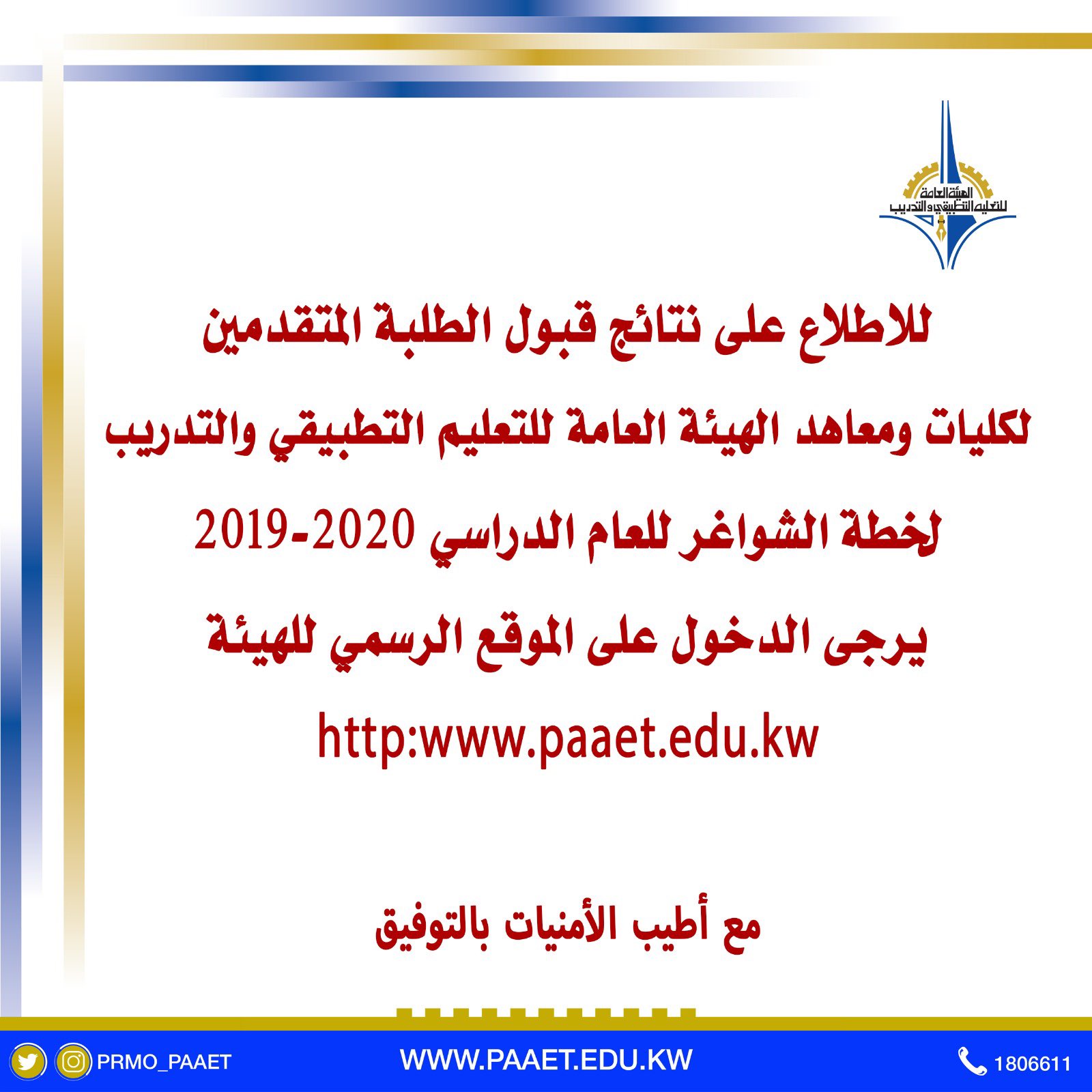 وقد اعتمدت مدير عام الهيئة العامة للتعليم التطبيقي والتدريب بالتكليف الدكتورة فاطمة الكندري نتائج القبول الطلبة. تعميم صادر عن آلية العمل خلال المرحلة الثانية وما بعدها وحتى العودة للعمل بنظام الدوام الرسمي المعتاد بالهيئة العامة للتعليم التطبيقي والتدريب. المنصات التعليمية الدعم الفني للتواصل مع مكتب المساعدة الخاص بالحاسب الآلي الاتصال على الرقم 22068036 او رقم البدالة في الفترة الصباحية 1806611 داخلي 1333. ختي تتمكن من التسجيل الإلكتروني في الكليات العسكرية لابد من ان تقوم بالذهاب الي الموقع.
