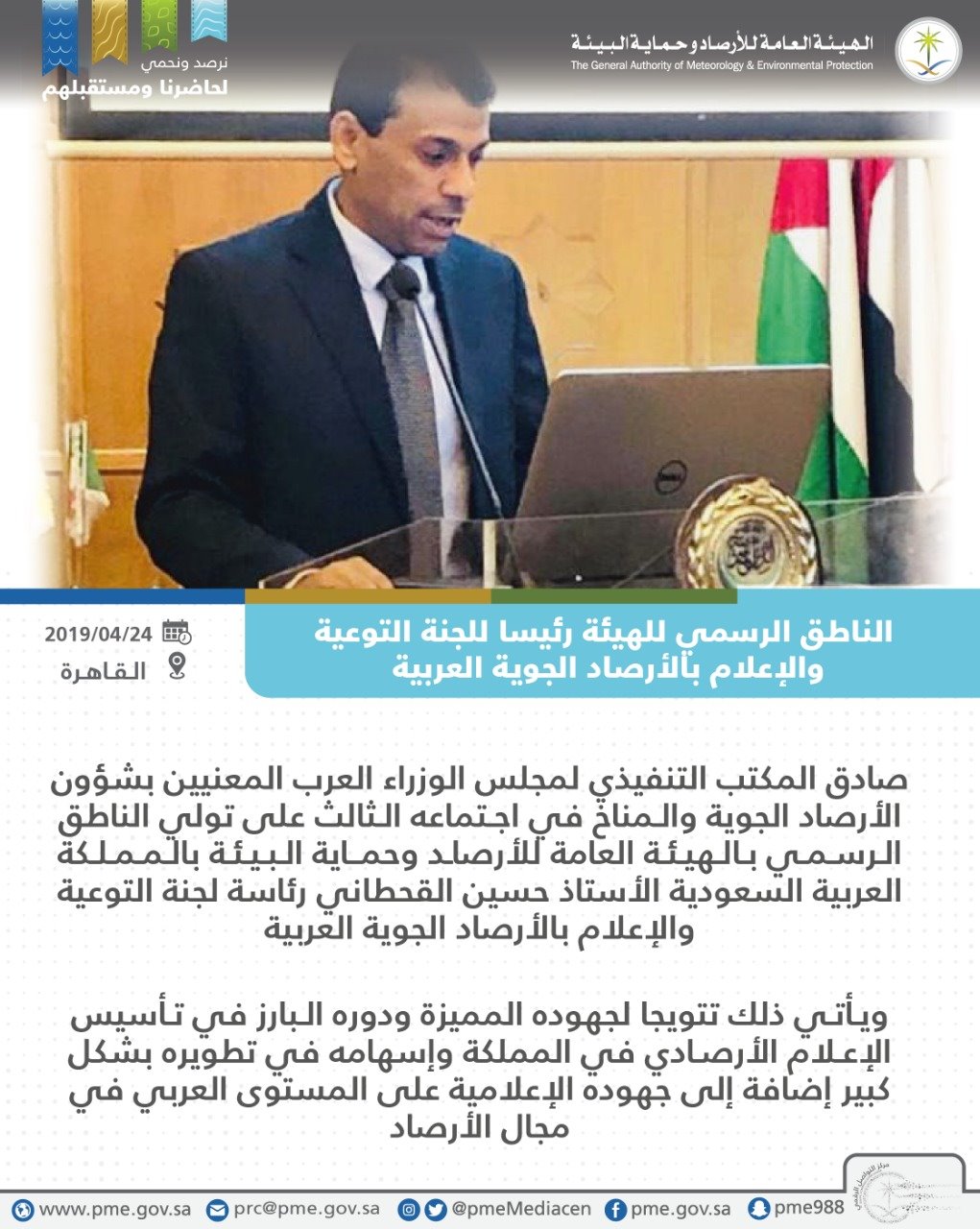 أوضح الناطق الرسمي بالهيئة العامة للأرصاد وحماية البيئة حسين القحطاني أن منى وعرفة جاهزتان بيئيا لاستقبال حجاج بيت الله من خلال المسح الشامل والجولات التفتيشية التي قامت بها الهيئة منذ وقت مبكر للتأكد من التزام. أكد الناطق الرسمي بالهيئة العامة للأرصاد وحماية البيئة الأستاذ حسين القحطاني أن الهيئة مظلة لجميع المهتمين بالطقس والمناخ وأنها تسعى لتحقيق التعاون المستمر والمثمر الذي يعزز دور توعية المجتمع بأهمية الظواهر الجوية. أوضح الناطق الرسمي بالهيئة العامة للأرصاد وحماية البيئة حسين القحطاني أن منى وعرفة جاهزتان بيئي ا لاستقبال حجاج بيت الله من خلال المسح الشامل والجولات التفتيشية التي قامت بها الهيئة منذ وقت مبكر للتأكد من التزام. تسجل الـ٥٠ يوم ا القادمة.