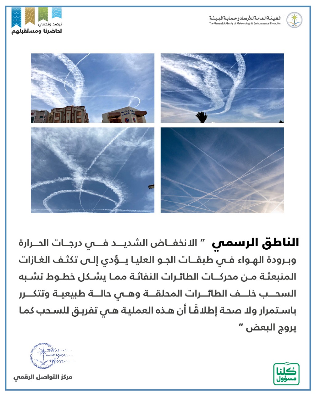 ونقل حساب الهيئة عبر موقع تويتر عن الناطق الرسمي قوله. أوضح الناطق الرسمي للرئاسة العامة للأرصاد وحماية البيئة حسين القحطاني حقيقة المتداول عبر مواقع التواصل حول مؤشرات لظواهر جوية حادة قد توثر في أجواء المملكة.