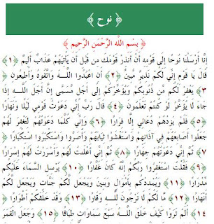 سورة نوح هي سورة مكية من المفصل آياتها 28 وترتيبها في المصحف 71 في الجزء التاسع والعشرين بدأت بأسلوب توكيد إ ن ا أ ر س ل ن ا ن وح ا إ ل ى ق و م ه أ ن أ ن ذ ر ق و م ك م ن ق ب ل أ ن ي أ ت ي ه م ع ذ اب. و الل ه أ نب ت ك م م ن الأ ر ض ن ب ات ا. و الل ه أ ن ب ت ك م م ن ال أ ر ض ن ب ات ا حين خلق أباكم آدم وأنتم في صلبه. سورة نوح بالرسم العثماني.