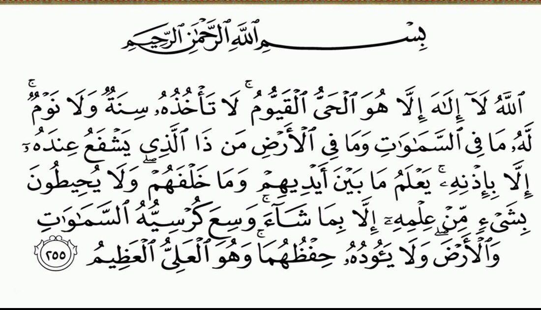 الل ه ل ا إ ل ه إ ل ا ه و ال ح ي ال ق ي وم ل ا ت أ خ ذ ه س ن ة و ل ا ن و م ل ه م ا ف ي الس م او ات و م ا ف ي ال أ ر ض م ن ذ ا ال ذ ي ي ش ف ع ع ند ه إ ل ا.