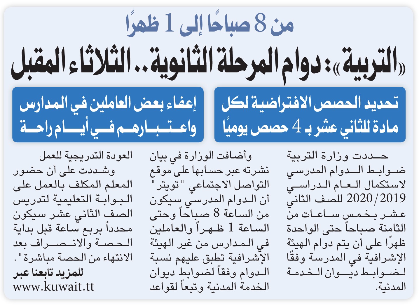 بداية الدوام الرسمي من الساعة. وج ه مدير جامعة حائل الدكتور خليل البراهيم بتأخير بداية الدراسة إلى الساعة التاسعة صباح ا ليومي الاثنين والثلاثاء 16 17 6 1441هـ الموافق 10 11. وقالت السيدة فوزية الخاطر إن العام الدراسي الجديد سيشهد تغيير موعد انتهاء الدوام الدراسي للمرحلة الابتدائية ليكون الساعة 21 30 ظهرا كما سيتم إبعاد الحصص المتقاربة وتدريس الطلاب 4 مواد فقط. حيث يبدأ الدوام الرسمي الساعة 7 30 صباحا في جميع المدارس لمده 15 دقيقه تليها بداية الدرس الأول الطلاب يغادرون الساعة 2 15 مساء لجميع الأيام الدراسية ما عدا يوم الخميس سيغادر الطلاب في 13 30. الصراحه نظاميه من كل شئ سواء في الدوام واي اي شئ كان والمهم لاحظت ان كل الموظفين ماشاء الله تبارك الرحمن يغادرون من بيوتهم في الصباح من بعد صلاه الفجر تقريبا الساعه 5 00 ص يعني يدلك على النظام.