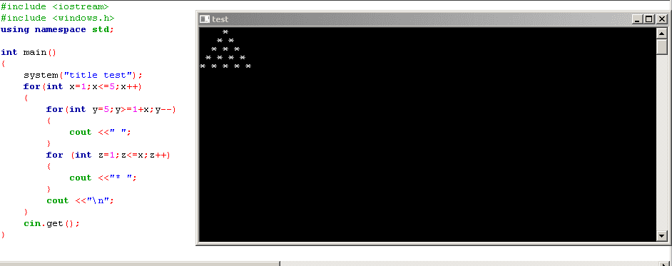 كيف أرسم مثلث والرقم 4 بالنجوم بلغة ال c أشكركم. أرجو المساعدة في هذا الموضوع حيث أنني أريد أن قوم بالرسم في c فأرجو من الأخوة الذين يعرفون كيفة الرسم ولو دائرة أو حتى نقطة أو مستقيم أن يساعدوني جزاهم الله خيرا. و لكن إذا قمنا بإزالة الـspace الذي في دالة cout في حلقة الـfor اخيرة سوف تلاحظ بأن الشكل لقد اختلف تماما. برنامج بنك الدم بلغة c حذيفه مصطفى محمد عثمان.