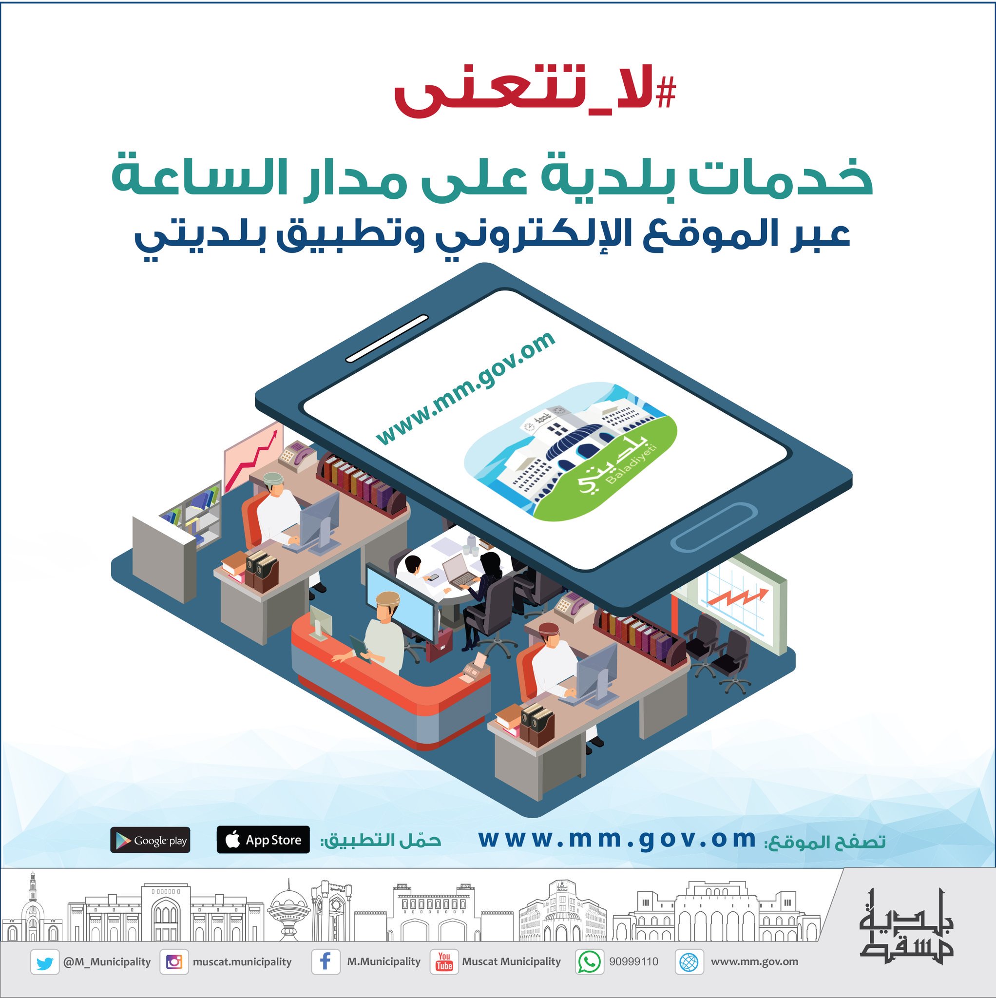 بلديتي الموقع الرسمي. تـم إلزام البقالات والتموينات بتوفير حلول الدفع الإلكتروني ابتداء من 10 مايو. طلباتي و رخصي. فوز تطبيق بلديتي بجائزة السلطان قابوس للإجادة في الخدمات الحكومية الالكترونية 2016 كأفضل خدمة إلكترونية عبر الهاتف المحمول. حصل تطبيق بلديتي على اثنين من أهم الجوائز في مجال المعلوماتية إذ فازت بلدية مسقط بجائزة أفضل خدمة إلكترونية عبر الهاتف المحمول ضمن جائزة السلطان قابوس للإجادة.