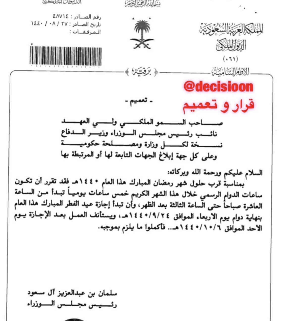 الكريم لجميع الأجهزة الحكومية والذي تقرر بموجبه أن تكون ساعات الدوام الرسمي خلال شهر رمضان المبارك لعام 1435هـ بمعدل خمس ساعات يوميا تبدأ.